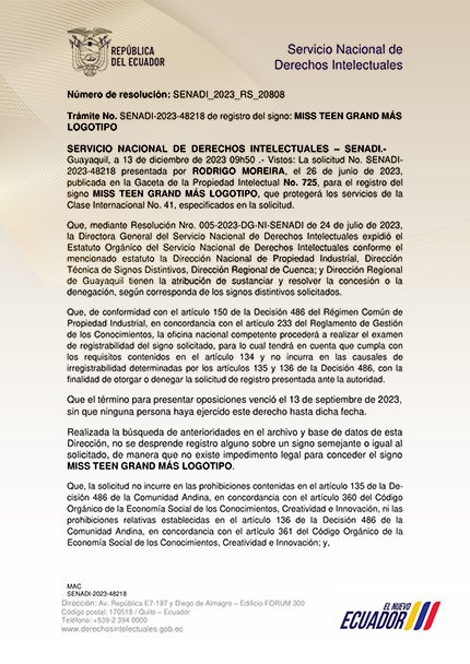 The trademark was granted by the National Service for Intellectual Rights – SENADI of the Republic of Ecuador on December 13, 2023.