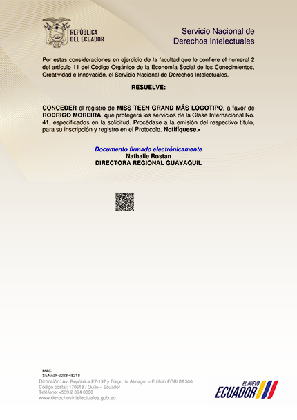 Rodrigo Moreira, Ecuadorian beauty pageant director, has acquired all intellectual property rights to the MISS TEEN GRAND trademark, in the international class no. 41 – beauty pageant organization – which gives him the right to choose the winner of the international title.